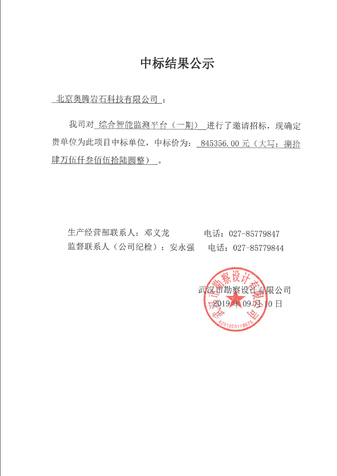 武漢市勘察設計有限公司綜合智能監測平臺(一期)中標結果公示